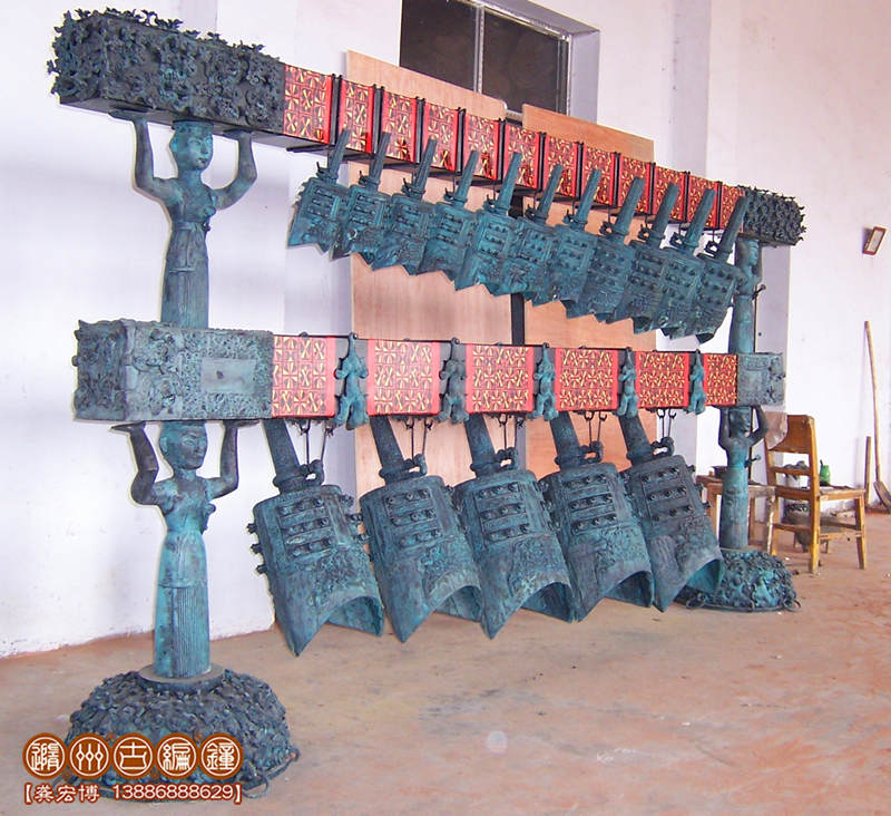 簡介:特制16件曾侯乙青銅編鐘,是隨州古編鐘公司根據(jù)客戶要求,按曾侯乙編鐘設(shè)計(jì)制作,編鐘為青銅鑄造,采用國際標(biāo)準(zhǔn)樂音音高A=440Hz調(diào)音,可以演奏古今中外樂曲,編鐘大梁采用優(yōu)質(zhì)松木制作,表面噴漆,彩繪花紋。