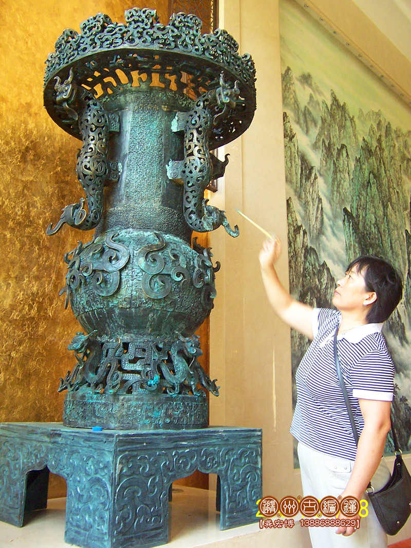 青銅尊造型端莊優(yōu)美,紋飾精巧、復(fù)雜,是現(xiàn)已出土的青銅器中最復(fù)雜、精美的珍品。尊高2.13米,敞口寬1米。尊是盛酒器,內(nèi)盛摻有香草汁的酒,祭祀時(shí)酌以敬獻(xiàn)神靈,賓禮時(shí)酌以飲客。青銅尊安裝 到湖北省接待重要貴賓的地方——武漢東湖賓館會(huì)議廳,同時(shí)訂購的還有青銅筒形器等,這些器物擺放 在中式裝修風(fēng)格的建筑中起到了畫龍點(diǎn)睛的作用,將它們擺放在會(huì)議廳,代表湖北燦爛的歷史文化。