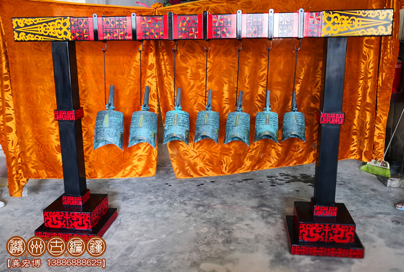 隨州古編鐘公司按客戶要求制作7件仿古編鐘,長2.35米×寬0.45米×高1.5米。編鐘外形按照聞名世界的隨州曾侯乙編鐘仿制,編鐘為青銅鑄造;采用標準音音高A=440Hz調(diào)音1——7,要求聲音清脆悅耳,有延續(xù)音,無啞音編鐘,編鐘大梁采用優(yōu)質(zhì)板材制作,表面按設計噴漆,彩繪花紋,配套演奏木錘1把,包裝木箱。