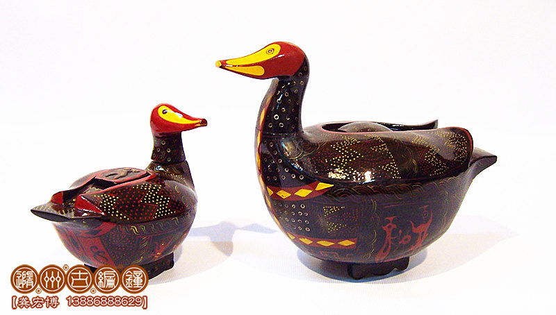 簡介:鴛鴦盒為木胎其身,體分兩半,制作再粘合成,頭頸與身體則榫卯相連,故頭能自由轉(zhuǎn)動。背上有一長方形口與蓋相扣合,蓋上浮雕龍紋。整器外髹黑漆,其上用紅色和金色描繪眼、嘴、羽毛以及菱形紋等。在它的腹部還描繪了建鼓舞和撞鐘擊磬的情節(jié)畫。