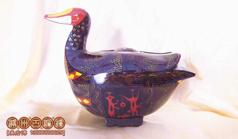 鴛鴦盒為木胎其身,體分兩半,制作再粘合成,頭頸與身體則榫卯相連,故頭能自由轉(zhuǎn)動。背上有一長方形口與蓋相扣合,蓋上浮雕龍紋。整器外髹黑漆,其上用紅色和金色描繪眼、嘴、羽毛以及菱形紋等。在它的腹部還描繪了建鼓舞和撞鐘擊磬的情節(jié)畫。考古顯示為古代宮女漆盒、木豆或胭脂盒。