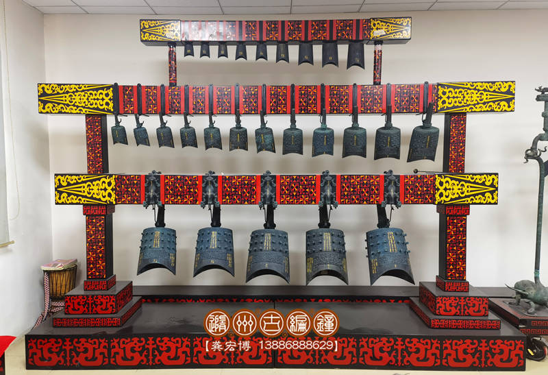 26件木結(jié)構(gòu)演奏級編鐘,是一套專業(yè)演奏類古樂器,整套編鐘分3層懸掛排列,由長短不同的三根彩繪橫梁和4個青銅佩劍武士立柱及2根圓立柱組成。編鐘由錫青銅鑄造而成,采用國際標(biāo)準(zhǔn)樂音音高A=440Hz調(diào)音,一鐘雙音,十二半音齊備,可以旋宮轉(zhuǎn)調(diào)演奏古今中外樂曲。編鐘下層懸掛5件倍低音甬鐘,音色低沉渾厚,在演奏中起烘托作用,使用鐘棒撞擊發(fā)音。中層12件編鐘從大到小依次排列,音色淳樸清澈,用于演奏樂曲主旋律。上層9件為倍高音鐘,音色清脆悅耳,用于演奏高音及復(fù)試旋律搭配。編鐘的彩繪橫梁采用優(yōu)質(zhì)實木板制作,表面噴漆并彩繪花紋;整套配套演奏工具一套,教學(xué)樂譜,另配有保管編鐘用的木箱,便于運輸和儲存。
