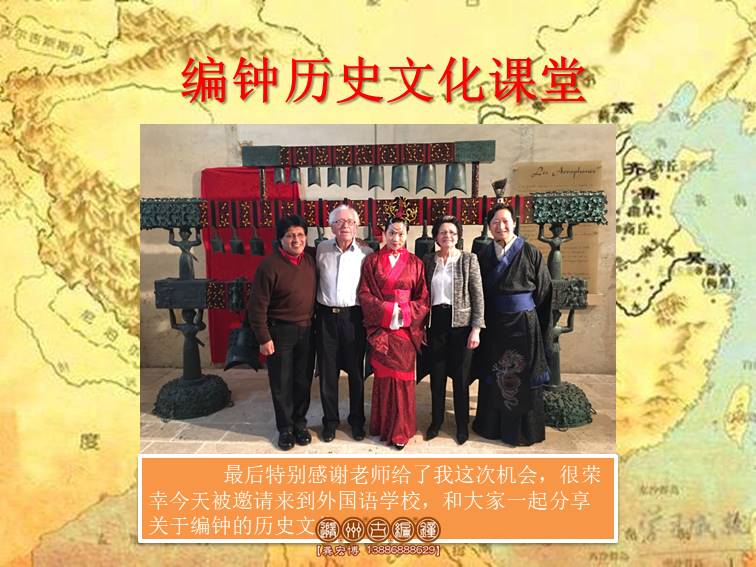 序:同學(xué)們,大家好!我是編鐘文化傳承人龔宏博,從我的父輩起就開始從事編鐘的復(fù)仿制工作,如今已有快30年了,感謝謝老師給了我這次機(jī)會(huì),很榮幸今天被邀請(qǐng)來到    學(xué)校,和大家一起分享關(guān)于編鐘的歷史文化。